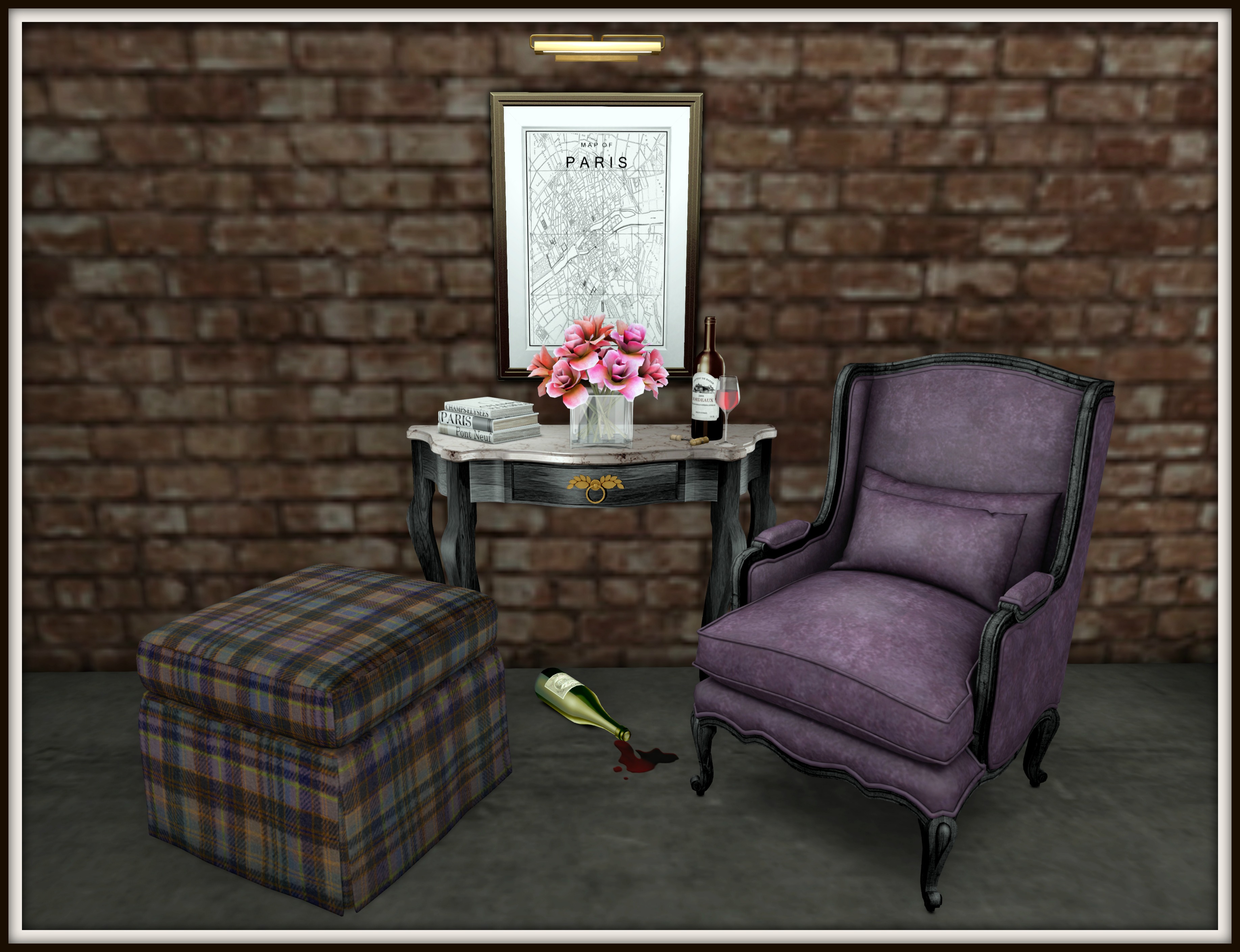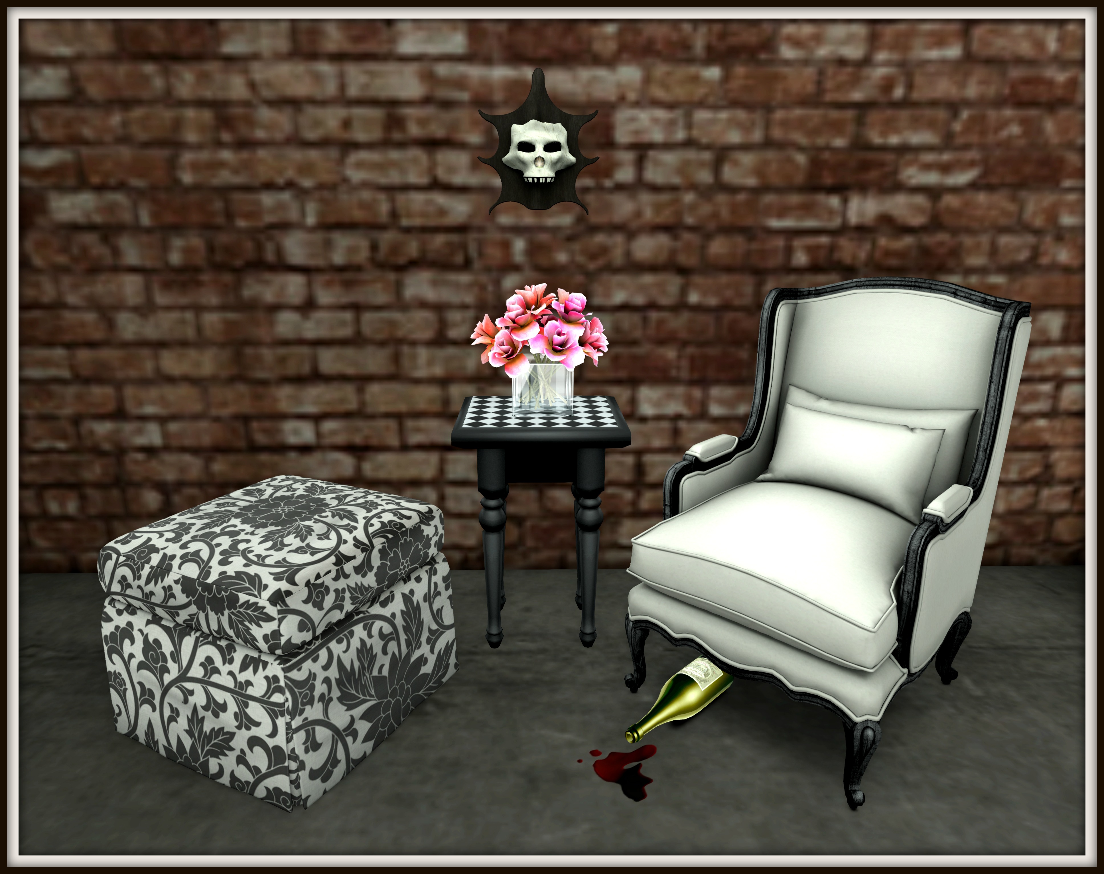 But, why stop there? To Halloween things up a bit I took the next shot with a side table also featured in 20TWENTY; this long-legged side piece is from the ‘Witches Diner Set’ by UNCERTAIN SMILE. I changed the textures on both the chair and ottoman, and also added a ‘Skully Wall Candle’ from DYSFUNCTIONALITY (who also feature in this months inaugural round of 20TWENTY) with the result making for a slightly spooked-up yet still classy place to rest your weary toes after a night of serious trickin’ and treatin’!