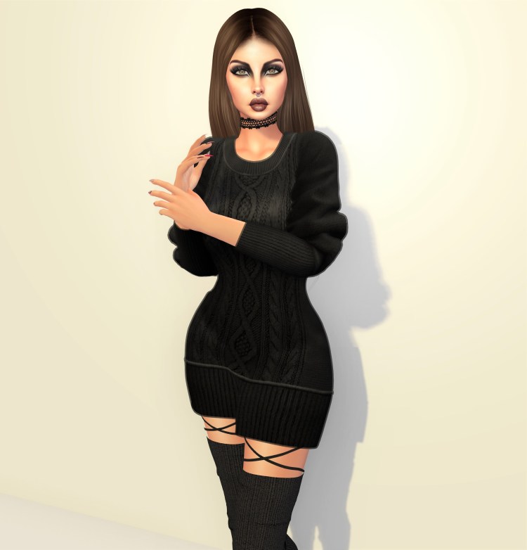 Let’s completely ignore the fact that my socks and frock leave a gap where I’m sure to feel a draught around my virtual tumpsy but anyway, I do like this long jumper from RINGO HANNA that I sourced from the latest TRES CHIC event. It’s your basic long knit style that we have kinda seen a million times before but it just works, you know?