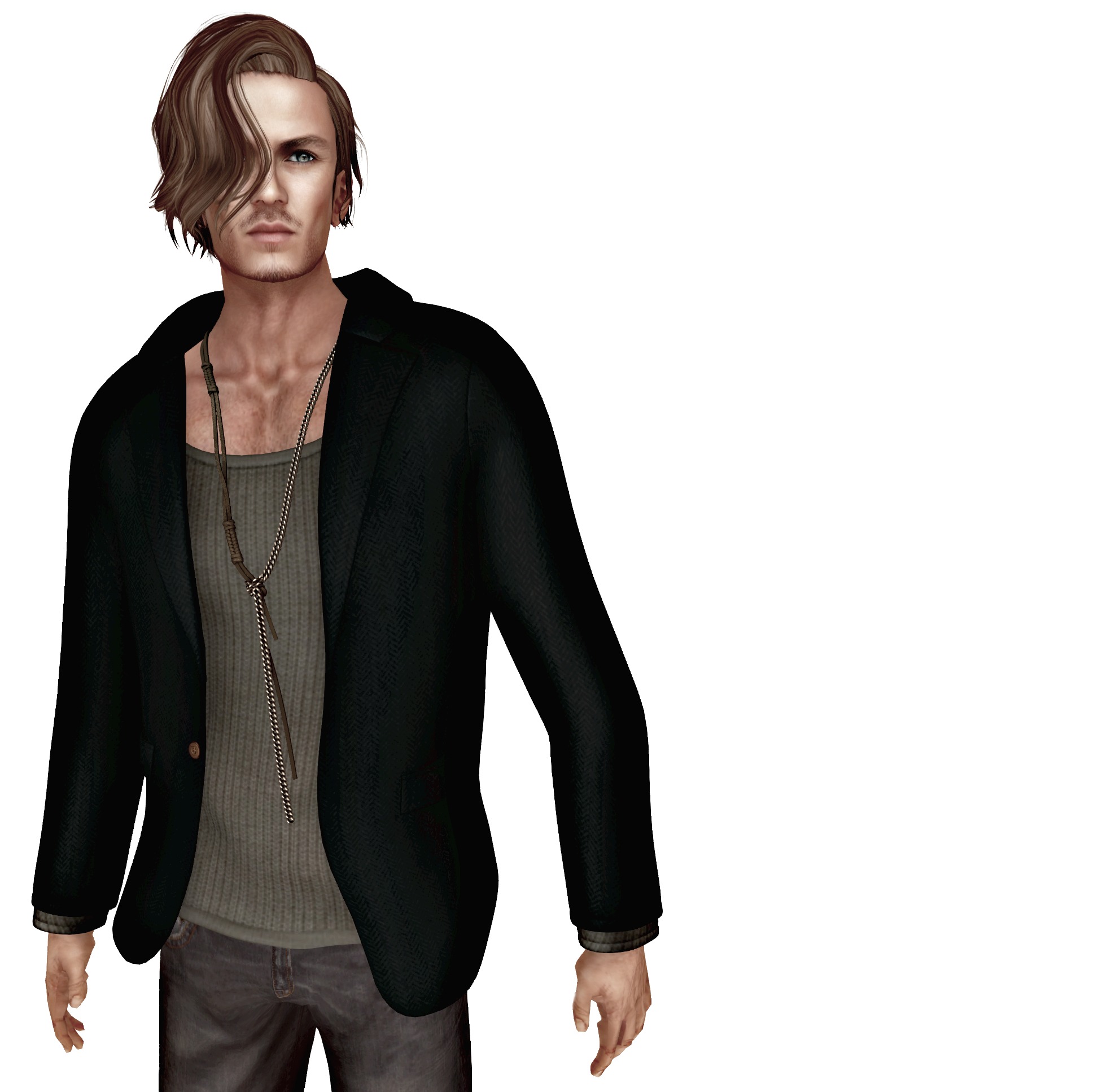 The other thing I don’t like is he has no eyelashes. I know it may seem a trivial point but I think it’s important; people have eyelashes so to my mind ‘Alex’ needs some too! I hate to see avatars without eyelashes; lashes frame the eyes and make such a difference to your appearance which can look incredibly flat without them. Besides, ‘Alex’ is pretty flat from the side anyway, unless you’ve managed to change the depth of his face with your slider settings but even then it does feel like he’s been hit in the chops with an iron skillet! Because he’s a mesh and 3D I want to see depth and dimension so anything that can provide that is worth adding to the package. Those minor criticisms aside, he still looks better in profile than many regular avatars you see on the grid, so he has that going for him I guess.