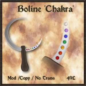 First up is a non-scripted gorgeous ‘Chakra Boline’, featuring crystals upon the blade that co-ordinate in gemstone colours with the chakra points upon the human body. It’s a very simple, elegant bolin which is nicely textured and is a highly affordable L$49.