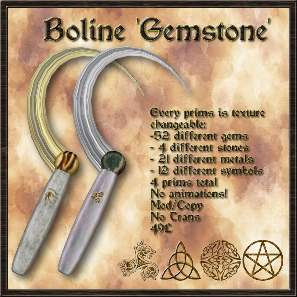 Slighty more special is her beautiful ‘Gemstone Boline’ Again, this costs L$49 but it has a lot of features. Every prim is texture changeable; there are 52 different gems in total, 4 different stones, 21 different metals and 12 different symbols including the Pentacle, Triquetra and Eye Of Horus amongst others. It’s an absolute bargain for the price and perfect to use in ritual. I’d seriously recommend this if you have a coven in-world, and even if you don’t I personally feel that it’s a must have for any Second Life Witch.